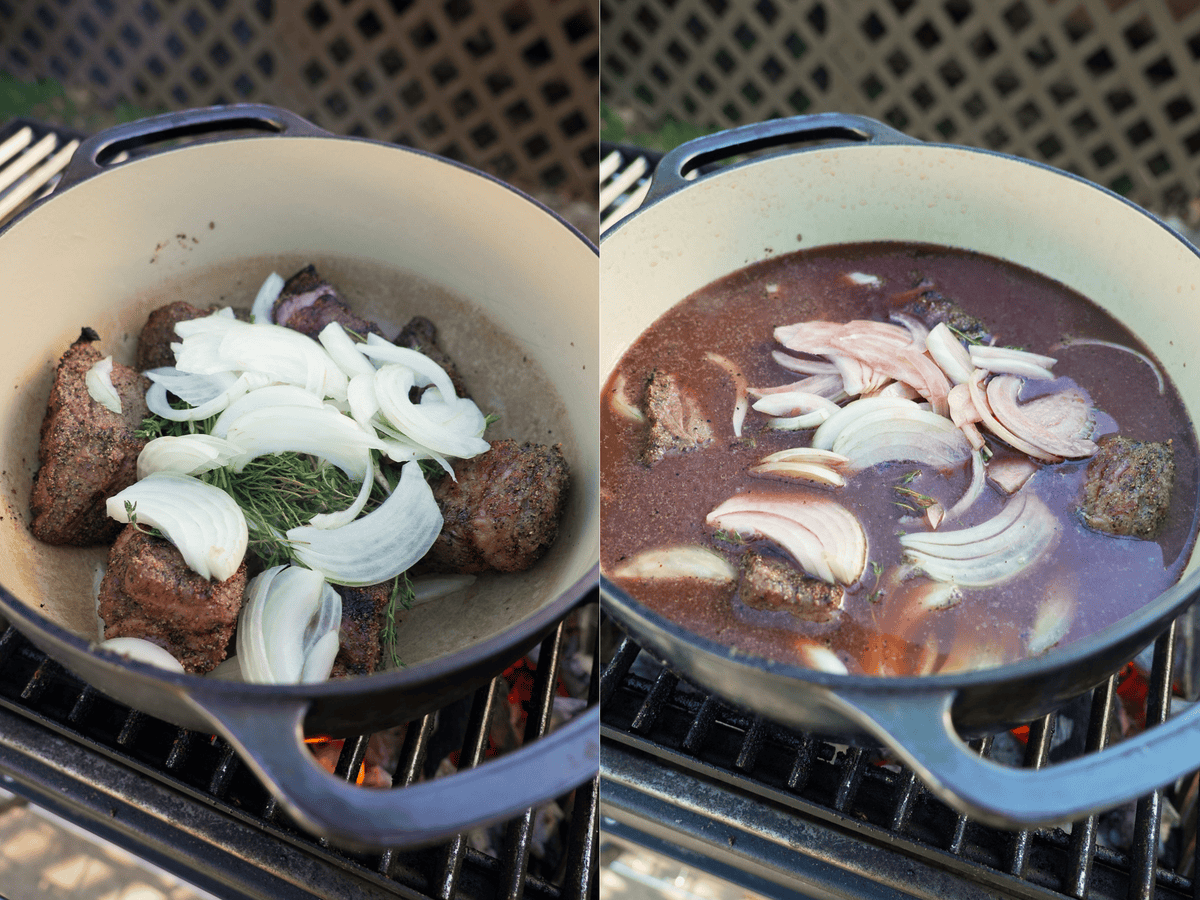 - Pull the beef off and place down your dutch oven. Add some oil then add the rosemary, thyme and red wine.